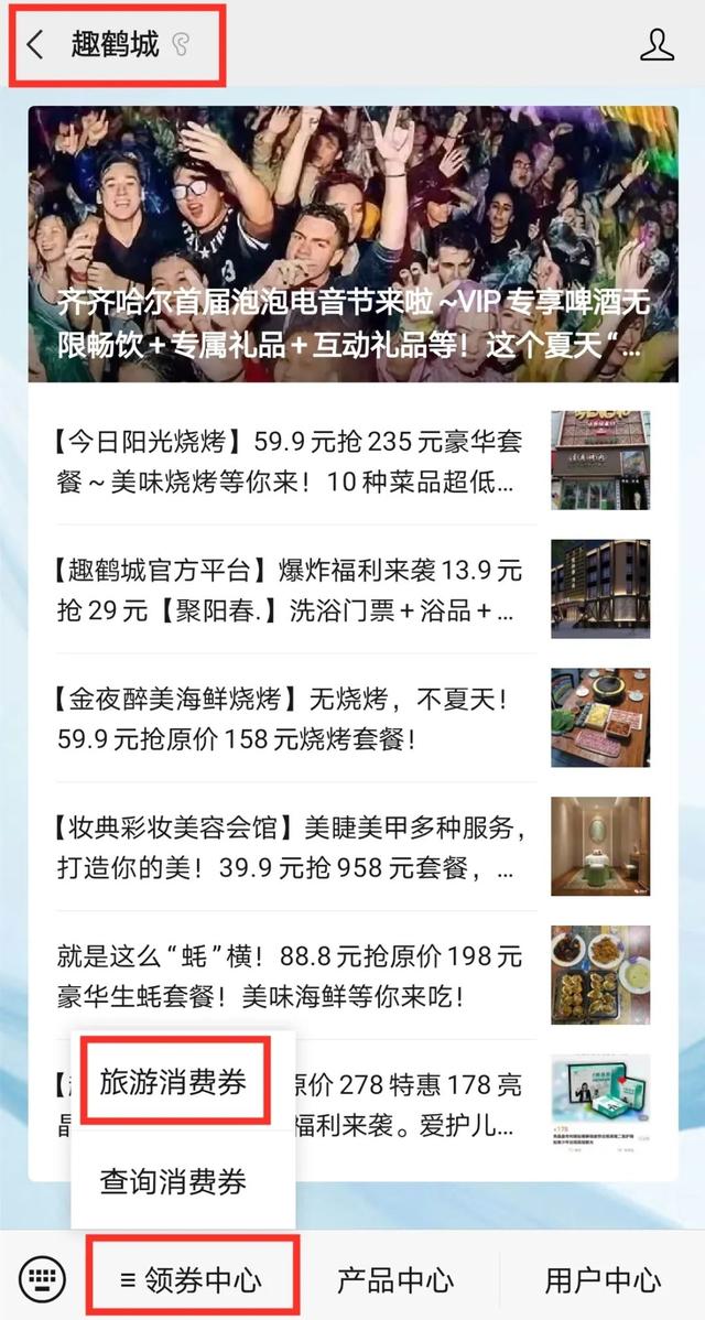 關注“趣鶴城”微信公衆号,點擊底部菜單欄“領券中心”進入活動頁面,輸入手機号和驗證碼後領取相應金額消費券。