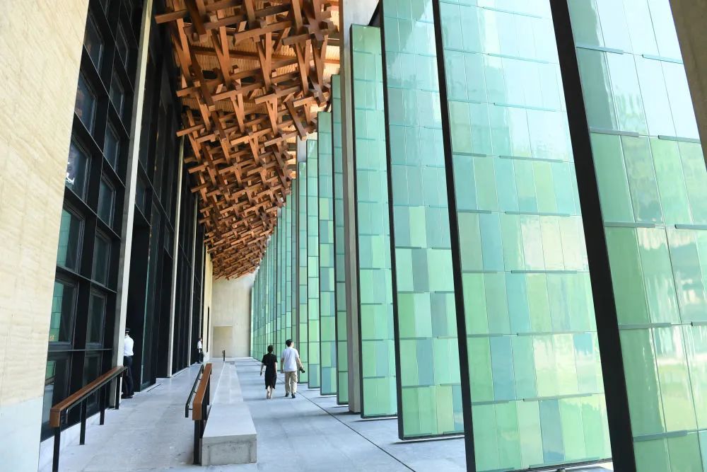 ↑杭州國家版本館屋頂的木構和青瓷門扇相映成趣(7月23日攝)。