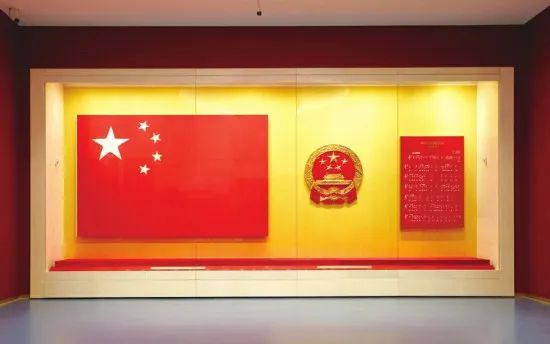 毛澤東親手按動電鈕升起的中華人民共和國第一面五星紅旗和中華人民共和國國徽、中華人民共和國國歌