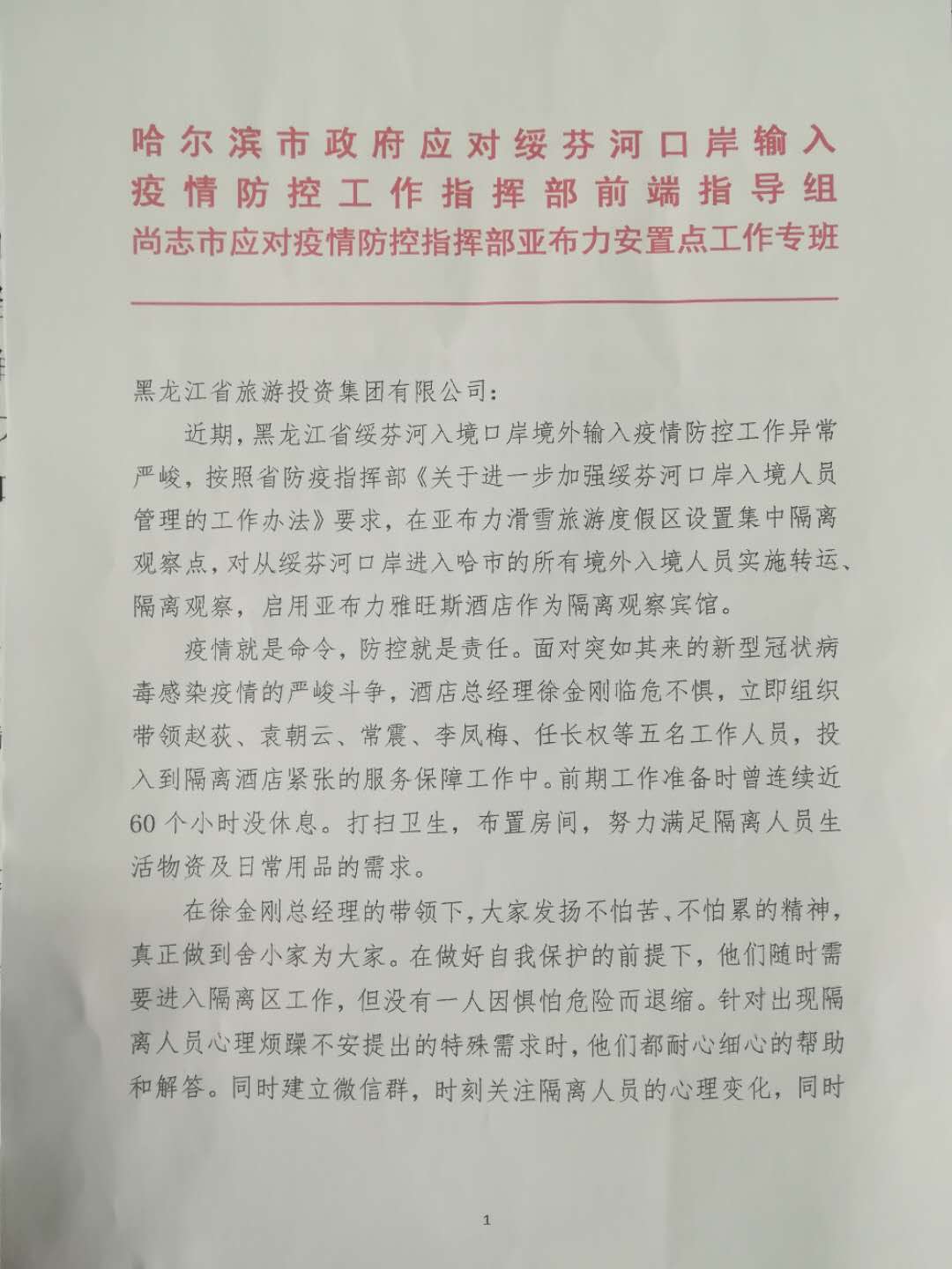 近日,哈爾濱市政府應對綏芬河口岸輸入疫情防控工作指揮部前端指導組、尚志市應對疫情防控指揮部亞布力安置點工作專班,向开云体育發來表揚信,表揚集團權屬企業酒店管理公司及有關人員不怕苦、不怕累、不懼艱險、甘于奉獻,舍小家為大家,晝夜服務在疫情防控第一線,做到了暖心、關心、愛心“三心”服務,圓滿完成了被隔離觀察人員的隔離觀察任務。